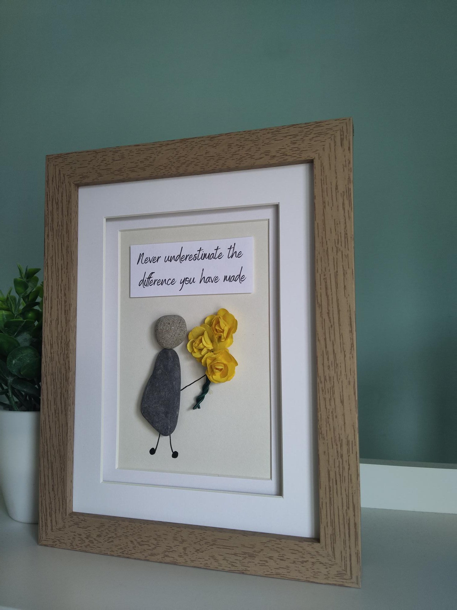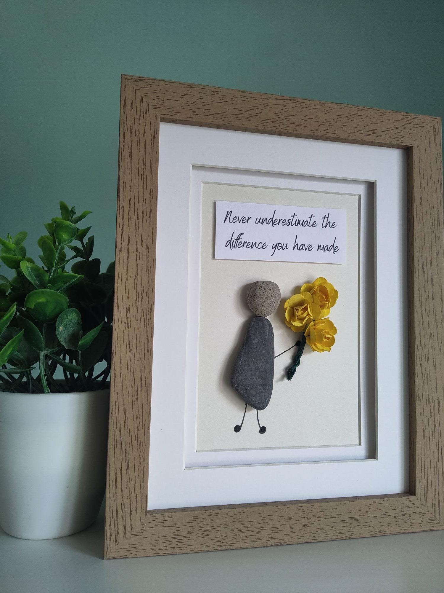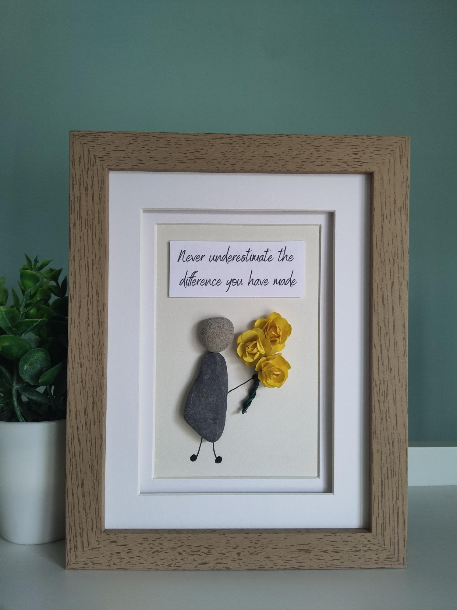 'Never Underestimate The Difference You Have Made' is the perfect quote to show you care with our pebble art figure presenting a yellow bouquet our flowers